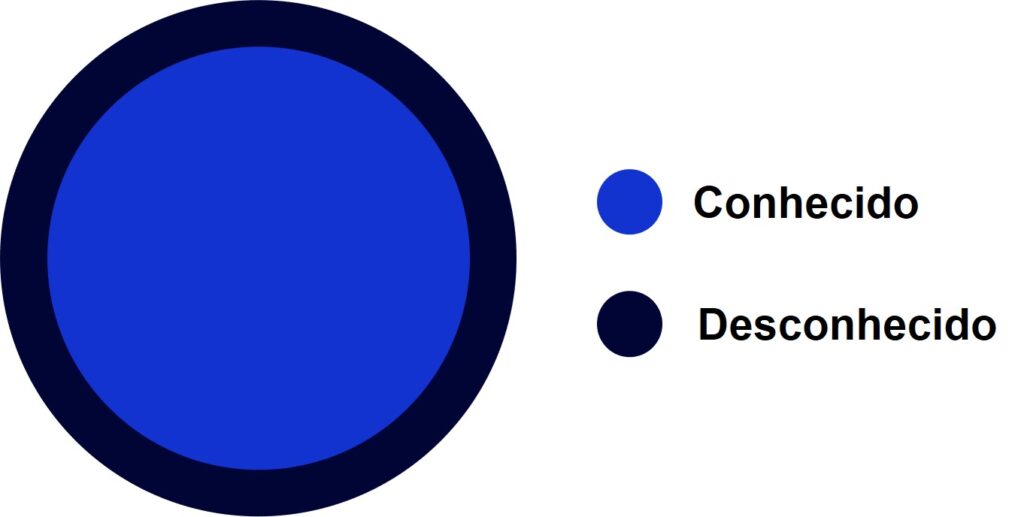A figura abaixo ilustra a situação, onde a área azul mais clara representa o que sabemos e a mais escura o que, após adquirirmos conhecimento, sabemos que existe mas ainda não dominamos.
